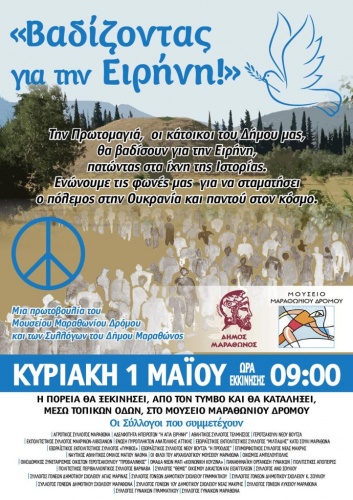 Την Πρωτομαγιά, οι κάτοικοι του Δήμου Μαραθώνος, θα βαδίσουν για την Ειρήνη, πατώντας στα ίχνη της Ιστορίας. Σε μια διαδρομή, περίπου 6 χιλιομέτρων, από τον Τύμβο έως το Μουσείο Μαραθωνίου Δρόμου, όσοι συμμετέχουν θα ενώσουν τη φωνή τους για να σταματήσει ο πόλεμος στην Ουκρανία και παντού στον κόσμο, ένα επίκαιρο αλλά και διαχρονικό αίτημα όλων. Ιδιαίτερα για τους Μικρασιάτες πρόσφυγες της περιοχής μας , που γνώρισαν την προσφυγιά και τον ξεριζωμό, η ανάγκη για την στήριξη και την ενίσχυση της ειρήνης είναι επιτακτική. Ένα εθνικό αίτημα του ελληνισμού που υπομένει, από το 1974, τη διχοτόμηση της Κύπρου, εξαιτίας της τουρκικής εισβολής. Φέτος, η Παγκόσμια Ημέρα των εργατών, αλλά και των λουλουδιών της Άνοιξης, αποκτά μια ιδιαίτερη σημασία, αφού ταυτίζεται με την κοινή απαίτηση για ειρήνη και ευημερία. Άλλωστε ευημερία και καλύτερες συνθήκες δουλειάς διεκδικούσαν στο Σικάγο οι εργαζόμενοι, που εξεγέρθηκαν το 1886, για την καθιέρωση του 8ώρου εργασίας. Ο εορτασμός της Πρωτομαγιάς, σημαίνει, ακόμη, την αρχή του καλοκαιριού και τη νίκη της ομορφιάς της φύσης. Ως μία τέτοια ημέρα ορόσημο, λοιπόν, επιλέχθηκε, η φετινή Πρωτομαγιά από το Μουσείο Μαραθωνίου Δρόμου και τους Συλλόγους του Δήμου Μαραθώνος, για ένα οδοιπορικό Ειρήνης, με στόχο να καθιερωθεί και να επαναλαμβάνεται κάθε χρόνο. Η πορεία θα ξεκινήσει, την Κυριακή 1η Μαΐου, στις 9 π.μ., από τον Τύμβο και θα καταλήξει, μέσω τοπικών οδών, στο Μουσείο Μαραθωνίου Δρόμου. Εκεί θα περιμένουν όσοι δεν ακολούθησαν την πορεία και όλοι μαζί θα γιορτάσουν την Ημέρα με το πλέξιμο των στεφανιών, υπό τους ήχους όμορφης μουσικής. Να είμαστε όλοι στον Τύμβο την 1η Μαϊου στις 9 το πρωί. Πληροφορίες: Ειρήνη Σπανού, Υπεύθυνη Μουσείου Μαραθωνίου Δρόμου, τηλέφωνο επικοινωνίας: 6977463266, e-mail: mouseio@marathon.gr Οι Σύλλογοι που συμμετέχουν: - Αγροτικός Σύλλογος Μαραθώνα - Αδελφότητα Ηπειρωτών «Η Αγία Ειρήνη» - Αθλητικός Σύλλογος «Φειδιππίδης» - Αθλητικός Σύλλογος «Τελμησσός» - ΑΠΣ Μιλτιάδης Μαραθώνος - Γεροτσακούλι Νέου Βουτζά - Ένωση Πυρόπληκτων Ανατολικής Αττικής - Εξωραϊστικός Πολιτιστικός Σύλλογος «ΤΥΜΒΟΣ» - Εξωραϊστικός Εκπολιτιστικός Σύλλογος «Μιλτιάδης» Κάτω Σούλι Μαραθώνα - Εξωραϊστικός & Πολιτιστικός Σύλλογος «ΑΥΡΑ» - Εξωραϊστικός Πολιτιστικός Σύλλογος Άγιος Γεώργιος Συνοικισμός Κάτω Σουλίου - Εξωραϊστικός Σύλλογος Νέου Βουτζά «Η Πρόοδος» - Επιμορφωτικός Σύλλογος Νέας Μάκρης - Ναυτικός αθλητικός όμιλος Ματιού (ΝΑΟΜΑ) - Οι Φίλοι του Αρχαιολογικού Μουσείου Μαραθώνα - Οικισμός Αμπελούπολης - Οικοδομικός Συνεταιρισμός Οικιστών Γεροτσακουλιού «Προβάλινθος» - Ομάδα Νέων Μάτι «Κοινωνική Κουζίνα» - Παναθηναϊκή Οργάνωση Γυναικών - Πολιτιστικές Απόπειρες - Πολιτιστικός Περιβαλλοντικός Σύλλογος Βαρνάβα - Πολιτιστικός Σύλλογος Μακρινών-Λιβισιανών - Σύλλογος «Θέμις» Οικισμού Δικαστών και Εισαγγελέων - Σύλλογος Άνω Σουλίου - Σύλλογος Γονέων 1ου Δημοτικού Σχολείου Νέας Μάκρης - Σύλλογος Γονέων Δημοτικού Σχολείου Αγίας Μαρίνας - Σύλλογος Γονέων Δημοτικού Σχολείου Γραμματικού - Σύλλογος Γονέων Δημοτικού Σχολείου Κάτω Σουλίου - Σύλλογος Γονέων Δημοτικού Σχολείου Μαραθώνα - Σύλλογος Γονέων Λυκείου Μαραθώνα - Σύλλογος Γονέων 1ου Νηπιαγωγείου Νέας Μάκρης -;Σύλλογος Γυναικών Γραμματικού - Σύλλογος Γυναικών Μαραθώνα Για την διευκόλυνση της επιστροφής των συμμετεχόντων, το τουριστικό γραφείο Timothy’s Family θα διαθέσει ένα πούλμαν 60 θέ