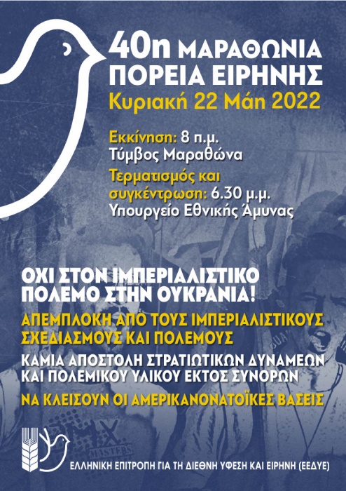 Η Ελληνική Επιτροπή για τη Διεθνή Ύφεση και Ειρήνη (ΕΕΔΥΕ) διοργανώνει την 40η Μαραθώνια Πορεία Ειρήνης την Κυριακή 22 Μάη 2022 και δημοσίευσε δελτίο τύπου με ανοικτή πρόσκληση για τη δράση αλλά και με τις θέσεις της πάνω στα μείζονα θέματα της επικαιρότητας.