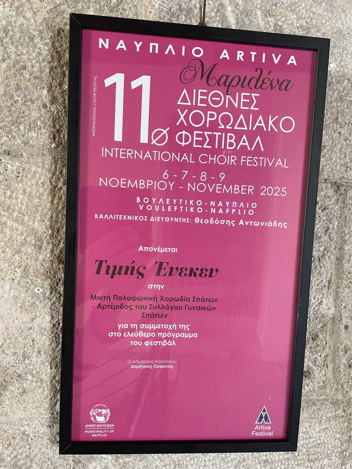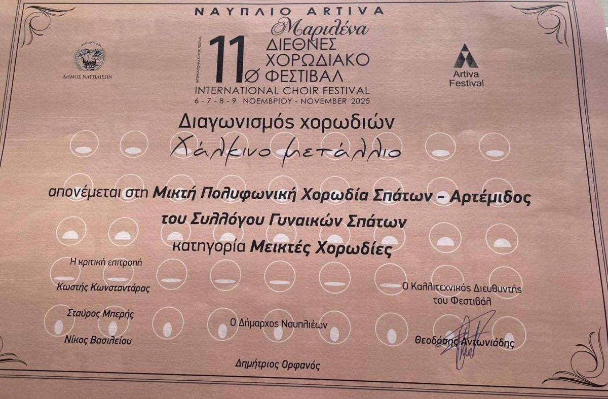 Η μικτή πολυφωνική χορωδία του Συλλόγου Γυναικών Σπάτων, του Δήμου Σπάτων-Αρτέμιδος, βραβεύτηκε με το χάλκινο μετάλλιο στον 11ο διαγωνισμό Ναύπλιο ARTIVA που έλαβε χώρα στο Βουλευτικό Ναυπλίου στις 7-8-9 Νοεμβρίου.