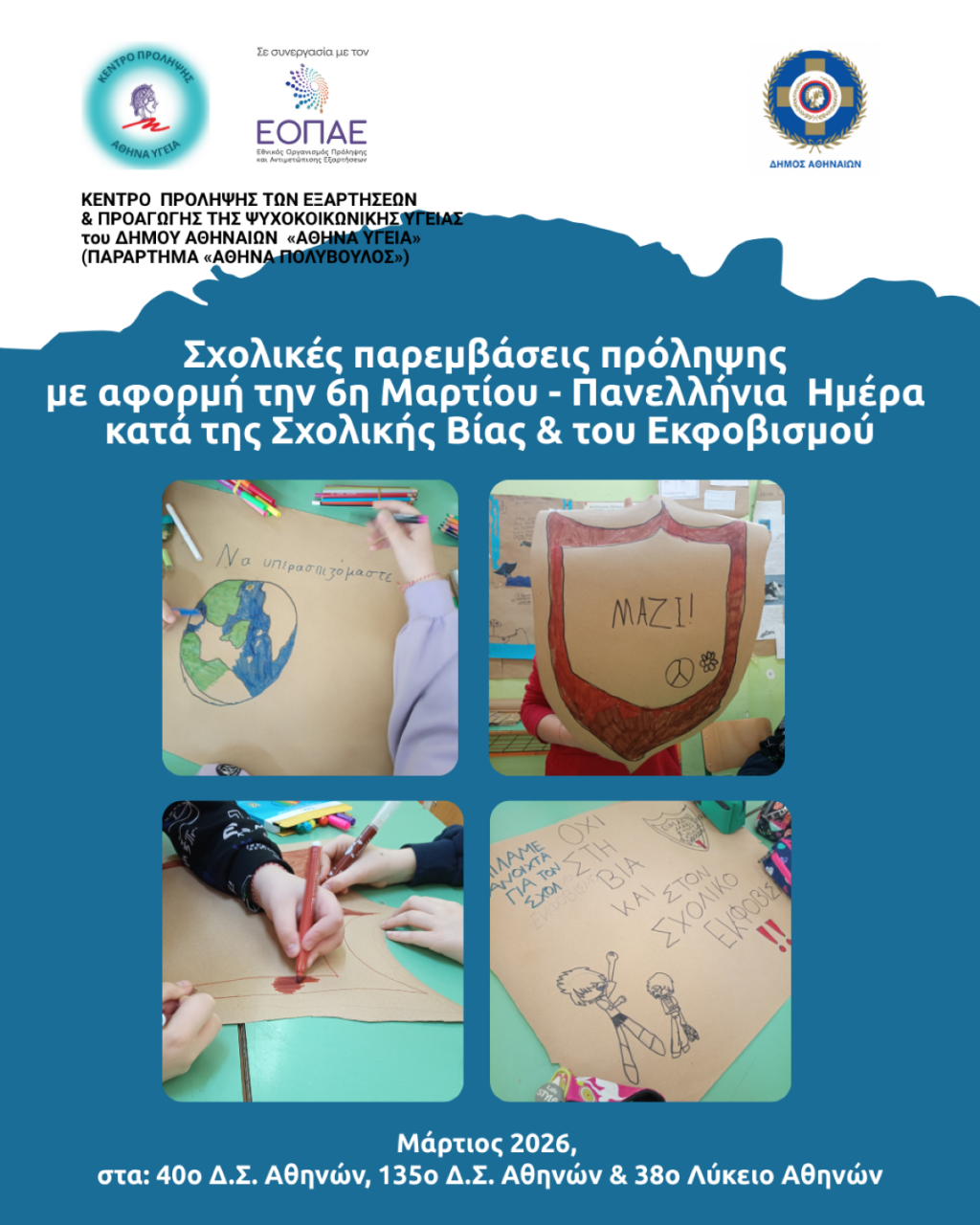 Για μία εβδομάδα, η επιστημονική ομάδα του Κέντρου Πρόληψης των Εξαρτήσεων & Προαγωγής της Ψυχοκοινωνικής Υγείας «Αθηνά Υγεία», που λειτουργεί σε συνεργασία με τον Εθνικό Οργανισμό Πρόληψης & Αντιμετώπισης Εξαρτήσεων (Ε.Ο.Π.Α.Ε.), υλοποίησε παρεμβάσεις στο 135ο Δημοτικό Σχολείο Αθηνών (Δ' τάξη), στο 40ο Δημοτικό Σχολείο Αθηνών (ΣΤ' τάξη) και στο 38ο Λύκειο Αθηνών (Γ' τάξη).