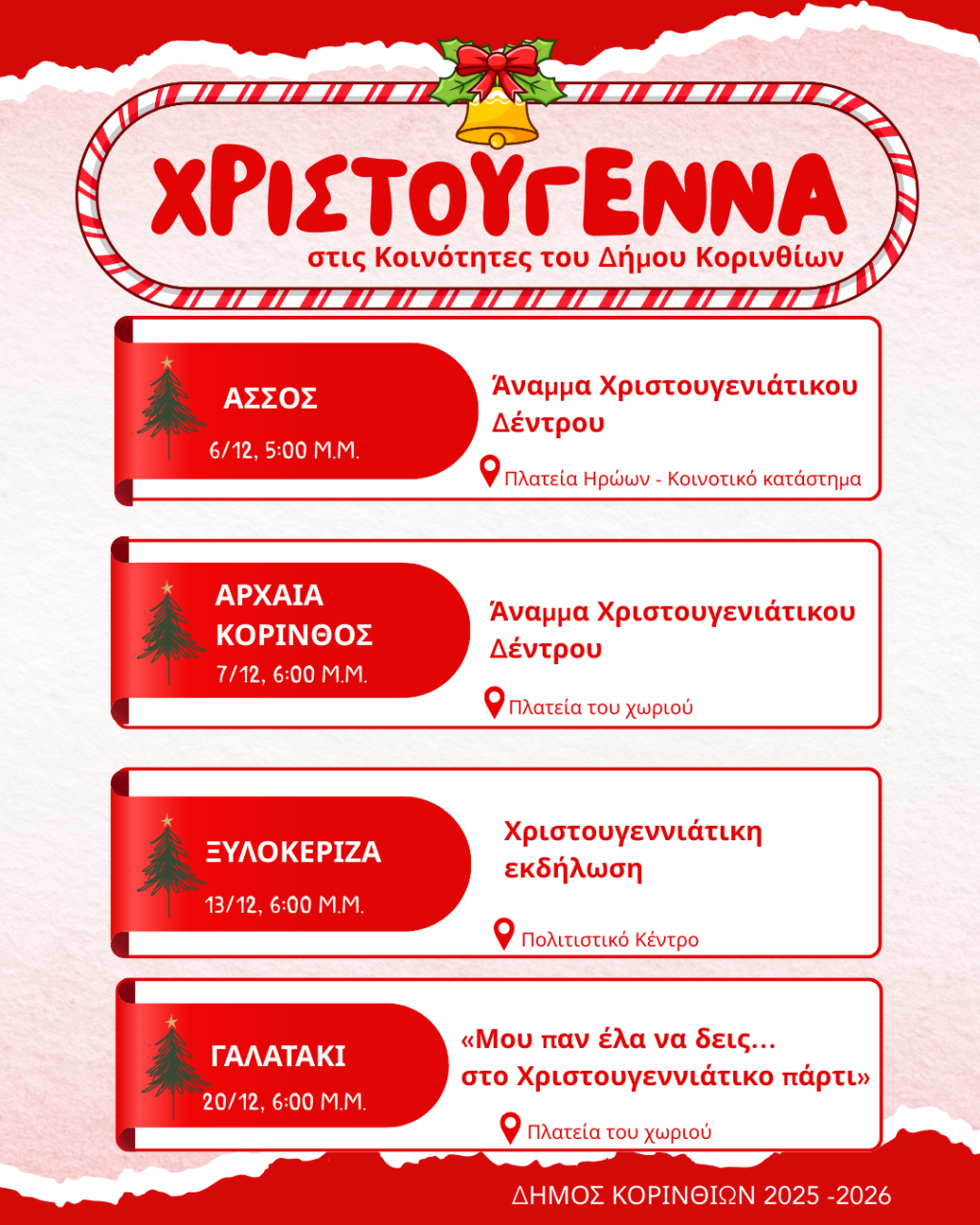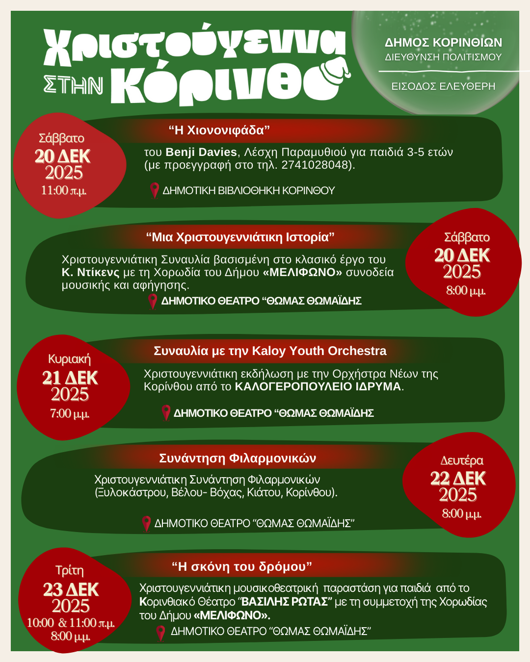 Έφτασε η στιγμή, με μεγάλη χαρά να παρουσιάσουμε το πλούσιο πρόγραμμα εκδηλώσεων που ετοίμασε η Διεύθυνση Πολιτισμού του Δήμου Κορινθίων: μουσικές παραστάσεις, θέατρο, χορός, παιδικές δημιουργικές δράσεις, χριστουγεννιάτικες χειροτεχνίες, το Χριστουγεννιάτικο Χωριό, καλλιτεχνικά δρώμενα και πολλές εκπλήξεις για μικρούς και μεγάλους.