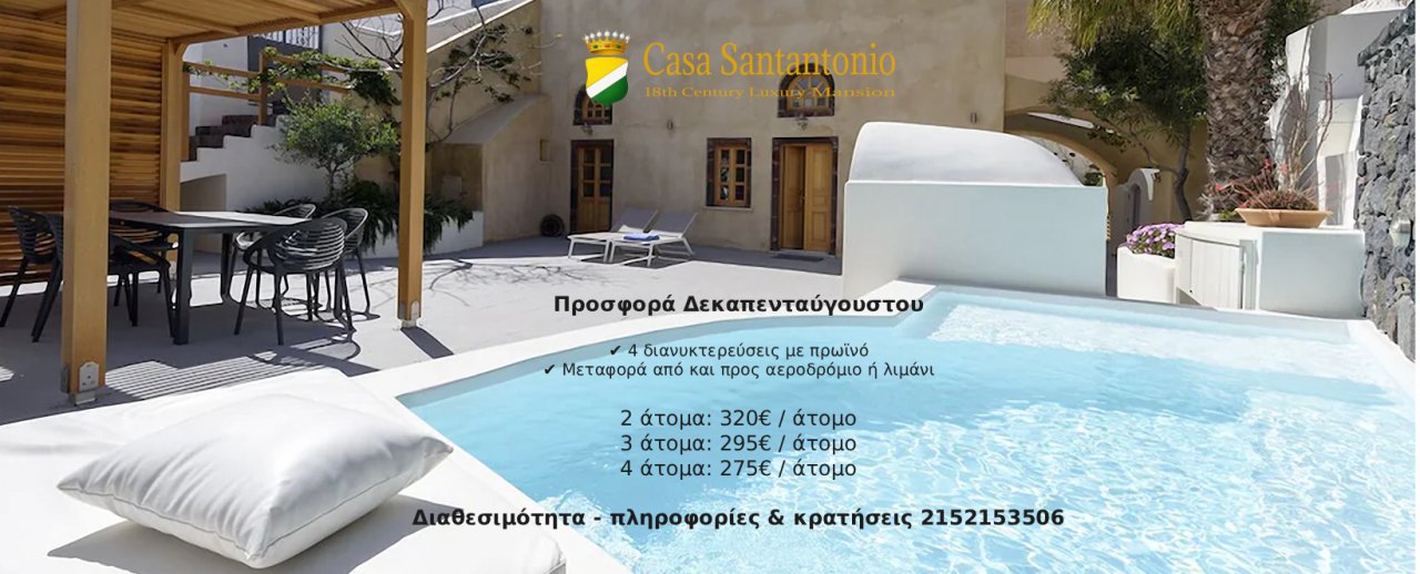 Αποδράστε για 4 αξέχαστες μέρες στη μαγευτική Σαντορίνη, με διαμονή στο πολυτελές Casa Santantonio - το ανακαινισμένο αρχοντικό του 18ου αιώνα στο κέντρο των Φηρών, με κορυφαία αξιολόγηση για την τοποθεσία και την εξυπηρέτηση!