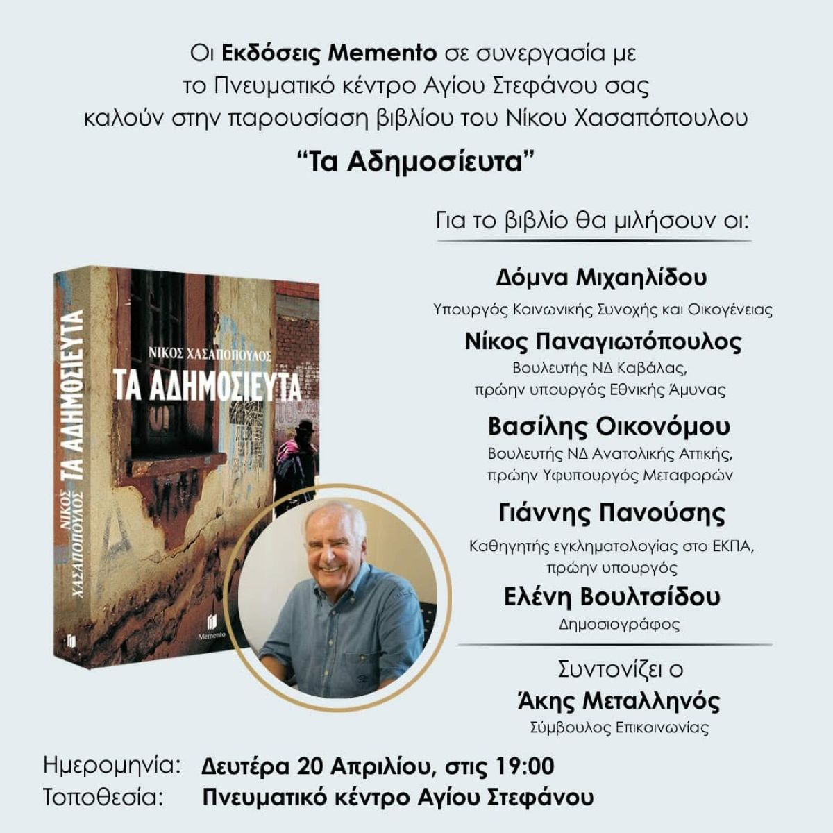 Οι Εκδόσεις Memento συνεργασία με το Πνευμαστικό Κέντρο Αγίου Στεφάνου σαν καλούν στην παρουσίαση του βιβλίου του δημοσιογράφου Νίκου Χασαπόπουλου «Τα αδημοσίευτα», τη Δευτέρα 20 Απριλίου στις 19:00.